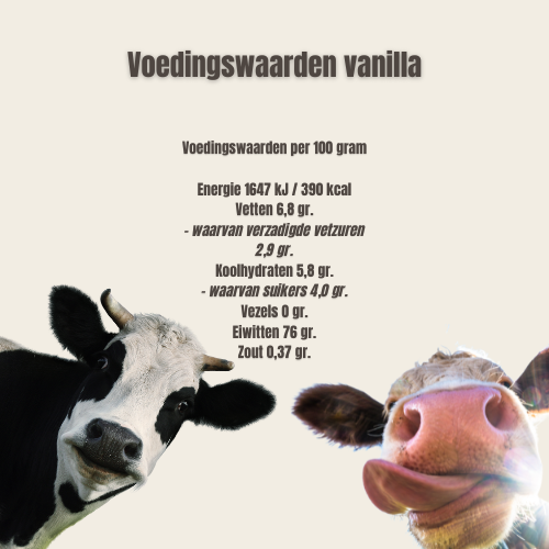 Ingrediënten vanille: Wei eiwit concentraat, zonnebloem lecithine, vanille aroma, verdikkingsmiddel (guargom), zoetstof (acesulfame k, sucralose)